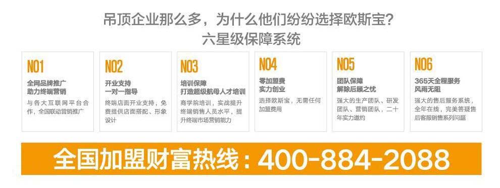 | 創富,實在才是王道。歐斯寶全國超600家專賣店見證品牌實力,六大實實在在的加盟優勢助你開拓財富之源: (1)O加盟費 選擇歐斯寶,不收取任何加盟費,免費專業解決你的創業困惑 (2)一對一店面幫扶 全程幫扶體系開通,一對一店面指導幫扶,幫您打造全面系統的營銷服務團隊 (3)10天培訓 免費提供專業的培訓機會,同時每年將會組織大型的導購學習機會,不斷提高專業學習機會,讓你全程掌握最專業的運營方式 (4)8次大型促銷活動 每年至少組織8次以上的大型促銷活動,引爆節假日銷量,實實在在賺得滿盤缽 (5)渠道幫扶 歐斯寶與互聯網家裝龍頭行業老大,土巴兔、搜房網、房天下、一號家居網,達成全國統一戰略合作,為經銷商客戶提供現成銷售渠道。 (6)48小時售后回復制度 在任何情況下,用戶可以通過我司服務部24小時運作的技術支持電子郵箱與客服聯系,我公司會在48小時內回復處理。 歐斯寶吊頂對加盟商的支持與回報 1、品牌支持:統一CIS文化、店面設計、操作流程,共享品牌資源。 2、營銷支持:大店特殊支持、全保姆式幫扶,幫你市場調研、店面選擇、員工培訓、市場開拓、上樣折扣支持、裝修支持。 3、廣告支持:總部負責在全國各大媒體投放廣告,并針對不同區域度身定做專項區域廣告。 4、技術支持:持續研發國際領先產品及技術,總部資深工程師全程指導。 5、開業支持:開店流程指導,店面裝修設計,店面運營監督,總部免費送開業大禮包。 6、活動支持:節假日免費活動策劃,總部給予讓利支持,享受專賣店樣板折扣。 7、返利支持:完成公司銷售指標后,可獲豐厚的銷售每期獎勵、年度獎勵及其它獎勵。 8、培訓支持:公司定期組織店面人員培訓,開業前期指導和不定期促銷活動開展。 |