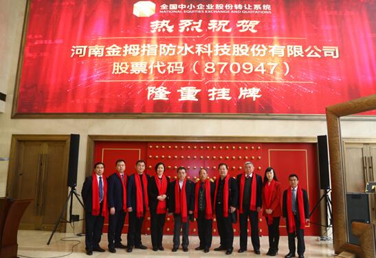 | 河南金拇指防水科技股份有限公司在2017年2月23日正式掛牌,并于2017年3月17日上午9時30分在全國中小企業股份轉讓系統成功舉辦了“新三板”掛牌敲鐘儀式,股票代碼:870947。 |