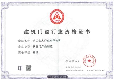 日前,浙江金大門業有限公司順利通過資質審核,獲得建筑鋼質門行業制造企業一級資質、安裝企業一級資質。據悉,金大門業也是國內首批取得建筑門窗