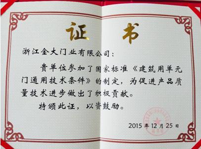 在隆重的頒獎盛典上,浙江金大門業(yè)很榮幸的得到來自行業(yè)各界的肯定與支持,評為國家行業(yè)標準《建筑金屬單元門》參編單位,而總經(jīng)理崔英杰先生也被評為2015年度中國門業(yè)“十大風云人物”。此外,金大門業(yè)積極參加國家標準《建筑用單元門通用技術條件》的制定,為促進產品質量技術進步做出了巨大貢獻。