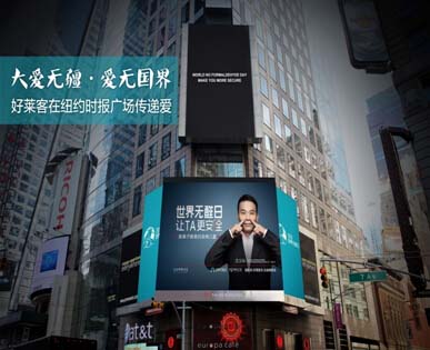 4月21日,好萊客“世界無醛日,讓TA更安全”登陸美國紐約時代廣場,向世界傳遞對白血病兒童的關注與愛護,更借此機會讓更多人關注并幫助白血病兒童。