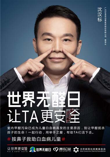 在國內,由北京新陽光慈善基金會發起的#按鼻子救助白血病兒童#話題正在傳遞,這是2016年世界無醛日主題“世界無醛日,讓TA更安全”的表現形式之一。話題一經發起,各界知名人士、網絡紅人、知名企業、網友、粉絲等紛紛積極響應,話題一度擠進新浪微博總榜NO.8,公益榜NO.1。