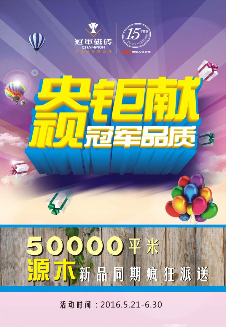 大城大商,需求使然。冠軍磁磚5-6月促銷鉅惠來襲,你還在等什么?不要猶豫,禮品已備好,只等你來拿! |