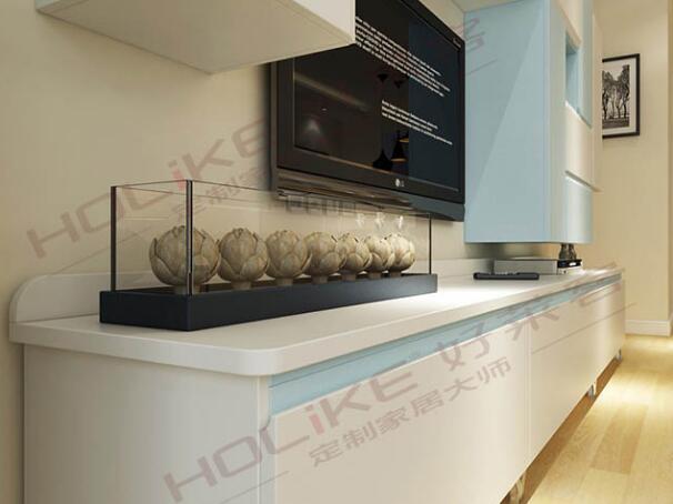 好萊客這款一字型懸空式電視柜,與地面保持一定距離,防潮防濕。墻面鋪以無拉手吊柜,環繞電視機,襯托電視機主體地位。沒有過多點綴,純凈的白,簡約風的客廳,每一處都透著令人沉迷的優雅。予空間一處明凈,予家一份溫馨。