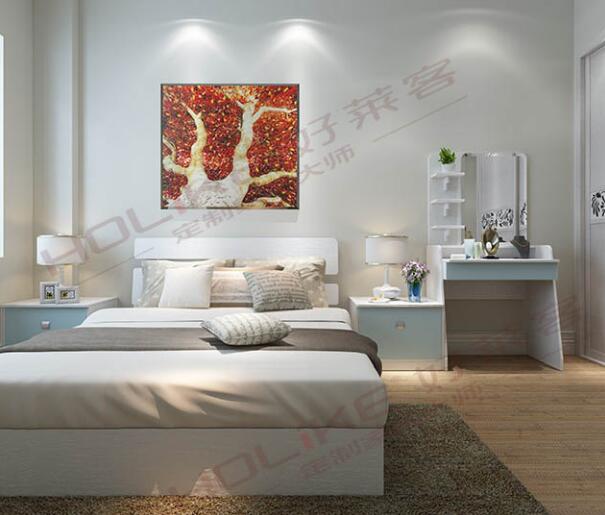 好萊客這款主臥的布置充分體現了現代簡約魅力,稍低的睡床,兩側輔以封閉式床頭柜。室內移門衣柜上方有橫梁,移門衣柜的存在,恰好填補了橫梁下方空間,平整而實用。線條雖簡,不忘輕松明快。