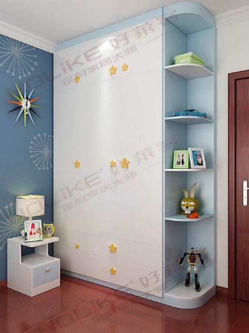 掩門衣柜的存在,為孩子的衣服被褥、玩具等保留了存放空間,柜門的星星點綴,增加了幾分童趣,一側的擱板置物層,增加了空間的靈動感。