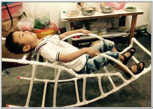 日豐管質地縝密,堅固可靠,在靈活扭轉后變身實用家具——椅子。下圖就是管道達人利用日豐PPR管道制作的擺椅,模擬中國式傳統太師椅造型,通過管件進行巧妙聯結,彎曲可達360°,除了椅座,還有椅子底座和椅子扶手,擺椅造型十分炫酷,坐在上面即使后仰也不會翻倒,休息、看電視時都可以使用,還有真人測試,堅固性相當強。