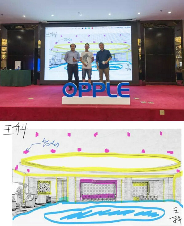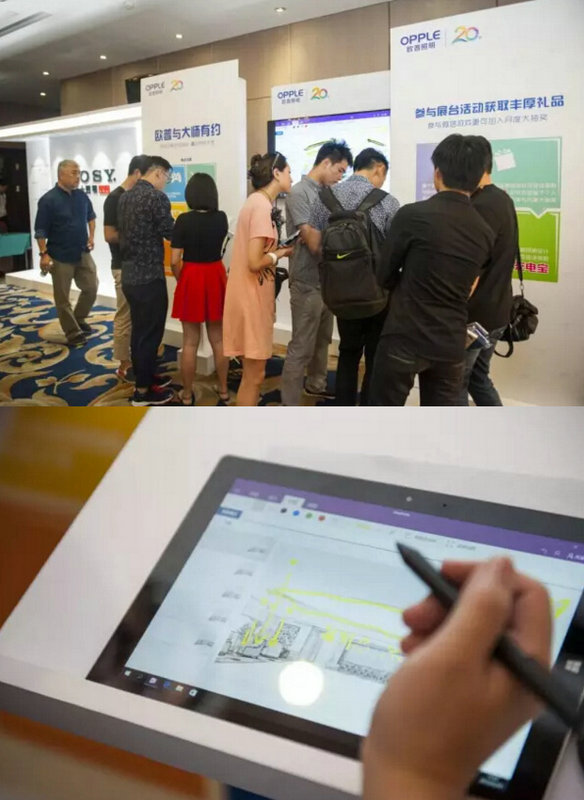 同樣的,成都站歐普展位處擺放了供到場設計師為酒店大堂進行照明設計的線條圖,并在現場邀請3位年輕設計師上臺分享自己的燈光設計作品,與兩位嘉賓進行互動。