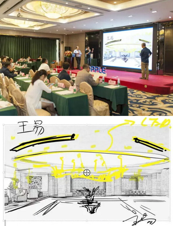 第一位上臺的是設計師王科先生。王科先生的設計草圖顏色十分豐富。他想給空間一種懸浮的感覺,所以在周邊用一圈藍色把整個空間抬起來,跟地面有一點分離的感覺。又用紫色表現一些主體性比較強的東西,用黃色光暈把整個空間輪廓勾勒出來。