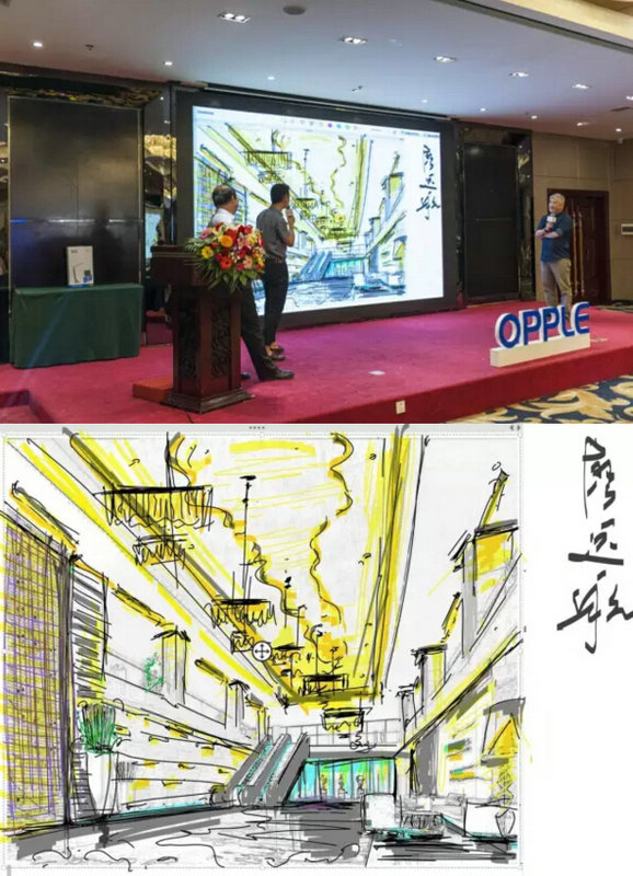 第三位是做室內設計的廖遠航。廖遠航用了大概半小時的時間完成了這幅有很多細節的設計草圖。他說照明設計首先有一個照明的作用,其次還要有點綴的功能。