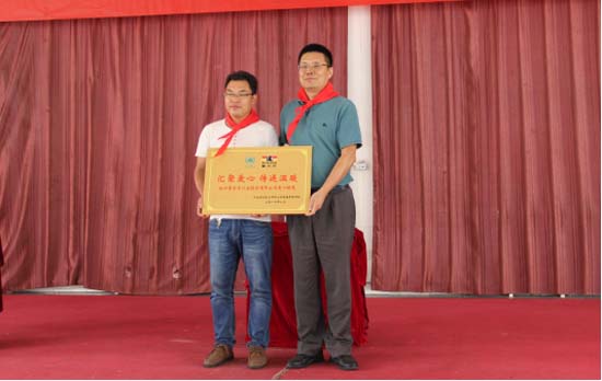霍爾茨木門總經(jīng)理趙崇聯(lián)與平山縣溫塘希望學(xué)校校長李軍為捐助儀式揭牌