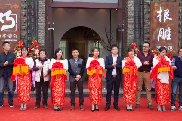 致辭完畢,主持人剪彩儀式正式開始,在彩炮、禮花、祝福聲中,完成了朽木傳奇館的剪彩。參與剪彩的特邀嘉賓有:根雕同業商會會長、木雕城實業有限公司董事長吳潔先生,中國根藝美術大師、閩侯上街根藝美術學會會長林茂官先生,中國根藝美術大師、中國根藝美術學會名譽副主席姜翔玲女士,先鋒工藝董事長陳先鋒先生,王林寶石雕根藝創作室創始人王林寶先生,曹小武工作室創始人曹小武先生,邱小熊工作室創始人邱小熊先生,創之源實業董事長吳星先生,鼓歌工藝董事長陳奮先生,518工藝董事長黃高松先生,家有名木總經理易翱先生,中創木業董事長吳融泉先生,西海木業總經理張德金先生,福建禾筑裝飾設計工程有限公司總經理林斌先生。