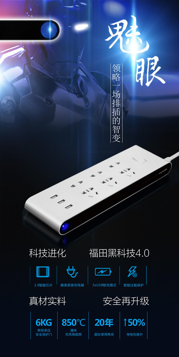 每一個產品的細節處理都是為了給消費者完美的使用體驗,例如:第一、每個福田魅眼USB排插的插頭都設計成凹凸的,就是為了符合人體力學,插拔更輕松。