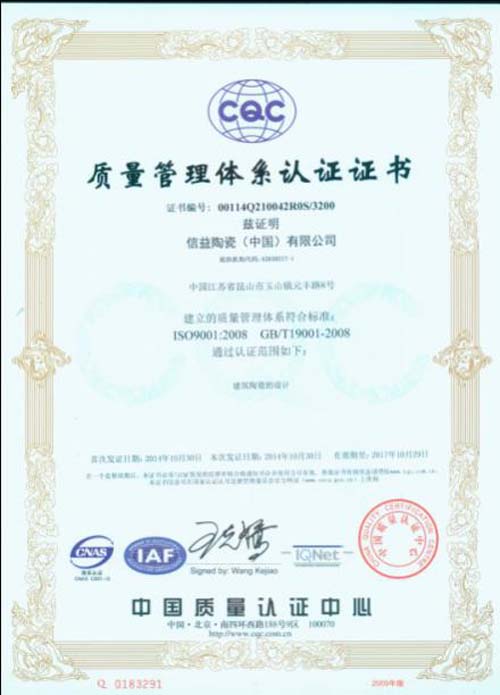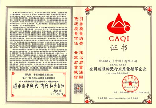 “產品質量是企業永恒的生命力,是產品競爭的基石,關乎著企業未來的發展大計”。在產品質量的檢測上,冠軍磁磚一直是積極響應國家質量誠信的最強音。從1999年起,各項產品檢測不僅符合國家標準,更遠超國標甚至歐盟的標準,成為中國瓷磚業界第一家榮獲ISO9001國際質量認證的瓷磚企業。2004年,通過中國瓷磚業界CQC認證機構的3C認證;經國家質檢總局、中國質量檢驗協會的全面鑒定,冠軍磁磚憑借卓越的品質,六星級的服務,連續多年獲得中國質量檢驗協會3.15“全國質量和服務誠信優秀企業”的榮譽,同時獲得“企業信用評價AAA級信用企業”的稱號。