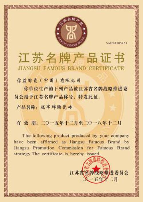 為了嚴格把控冠軍標準,冠軍磁磚在產品生產的過程中,通過國際標準檢驗及計量檢測設備完成自檢、互檢、抽檢等質檢程序,堅持定期審核,保證產品合格率達到98%以上。2013年冠軍磁磚更是推出了15年質保服務,以15年的時間來承諾消費者,保證產品“無變形、無褪色、無龜裂”,因此2016年“冠軍磁磚”被江蘇省授予“江蘇名牌產品證書”;同年被中國質量檢驗協會授予“全國建筑陶瓷行業質量領軍企業”,這不僅是對冠軍磁磚對品質重視的結果,也是廣大消費者對冠軍品質的認可。