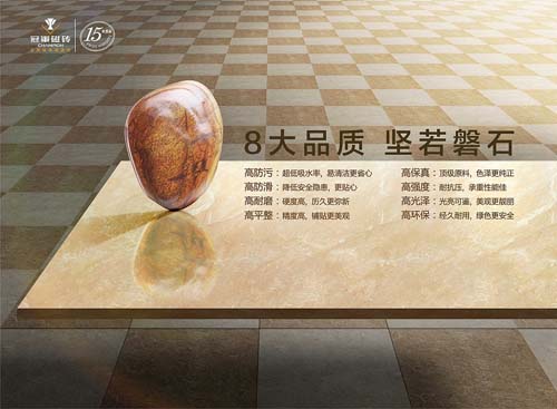 品質是產品的生命,在過去的四十五年中,冠軍磁磚始終堅持走品質路線,堅持生產高品質瓷磚,為消費者創造和諧自然的空間。相信在2017年,冠軍磁磚將承延“品質就是硬道理”的理念,視質量為企業的生命和品牌的根本,認真履行對消費者的各項承諾,誠懇接受社會各界的監督與檢驗,努力實踐“品質至上”的宏偉藍圖。
