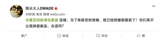 網友提到的體驗官資格是愛空間聯合新浪等權威媒體,于4月中旬在全國范圍發起的“挑戰愛空間”召集活動,活動不僅提供百萬裝修體驗金,還能讓消費者與20位媒體大佬們近距離吐槽家裝感受,體驗標準化家裝。有了百萬紅包和權威媒體背書及監督,迅速在消費者中掀起報名熱潮,由于抽中的體驗官需滿足在6月31日前開工首批體驗愛空間標準化家裝新品,這才有了網友要提前結婚湊裝修的事件。