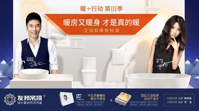2017圣誕季,伴隨成都、合肥大型回饋活動圓滿結束,“暖房又暖身 才是真的暖”友邦吊頂暖+行動 第3季完美落幕。與以往兩屆有所不同,暖+行動第3季不僅回饋力度更大,而且活動影響力較往年也大幅提升。本季暖+行動,友邦吊頂邀請到何潔、林依輪兩位人氣歌手,分別助陣成都站與合肥站活動,明星的參與不僅卷入了大批新老用戶,還大大增強了暖+行動及浴室干濕分區取暖系統的信息觸達,有效影響到更廣泛的潛在用戶群。