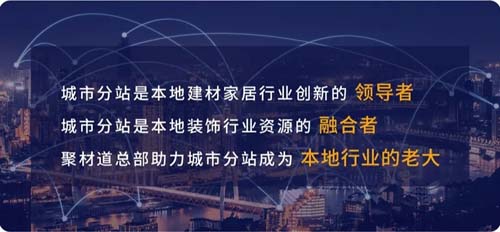 “聚材道”實行總部和城市分站一體化運作。總部提供全國性資源和系統工具的支持,城市分站融合當地資源、落地服務。一城一站,共創共享共贏。
