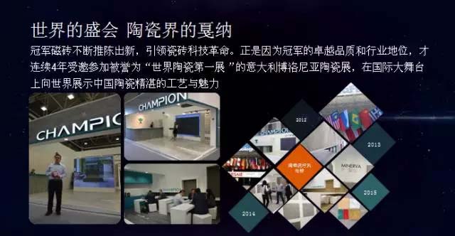 正是因為冠軍的卓越品質和行業地位,才連續4年受邀參加被譽為“世界陶瓷第一展”的意大利博洛尼亞陶瓷展,在國際大舞臺上向世界展示中國陶瓷精湛的工藝與魅力。