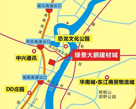 項目扼守城市對外主干道205國道,雄據河源城市門戶——釣魚臺片區,離粵贛高速市區出入口近在咫尺。位于粵贛高速南入口的五站合一的客運中心即將投入運營,是深圳、廣州、東莞等經濟發達的城市來河源的第一站,集火車站、客運站、公交站和碼頭站等多站一體。規劃中的惠州至河源城市輕軌即將正式啟動。總造價約6.5億元迎客大橋建設中,預計2015年年初建成投入使用。項目所在釣魚臺片區,主要圍繞商務、居住、產業園規劃建設,商貿物流發達、設施配套完善、人口密集度高,擁有發展大型商貿物流業無與倫比的優勢。