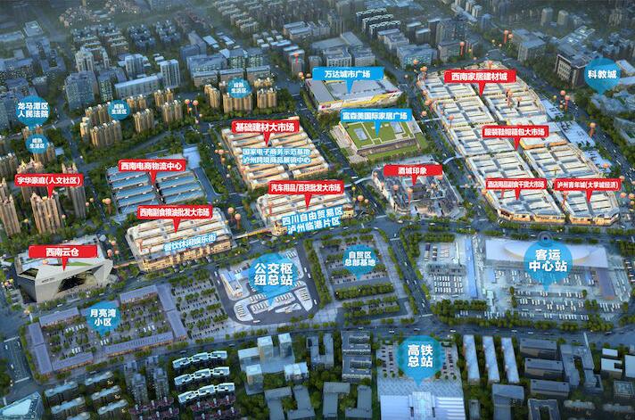 四川川南大市場有限公司 旗下經營管理的中國(瀘州)西南商貿城(以下簡稱“西南商貿城”)是瀘州市政府2009年招商項目,是四川省重大項目50強,項目占地1150畝,擬建160萬㎡,擬投資80億元。項目位于成渝城市群第三大城市—四川瀘州,緊鄰瀘州城際高鐵總站、瀘州客運中心站和瀘州公交樞紐總站,距正在新建的云龍機場和目前四川第一大港-瀘州港僅10分鐘車程,1小時通達川滇黔渝各地市。