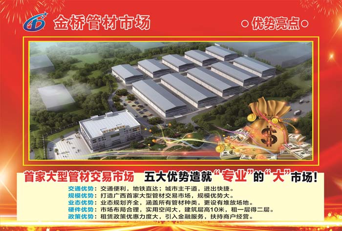 二、金橋管材市場優勢亮點: 金橋管材市場,首家大型管材交易市場,五大優勢造就“專業”的“大”市場! 1、交通優勢:交通便利,地鐵直達;城市主干道,進出快捷。 2、規模優勢:打造廣西首家大型管材交易市場,規模優勢大。 3、業態優勢:業態規劃齊全,涵蓋所有管材種類,更設有堆放場地。 4、硬件優勢:市場布局合理,空間靈活,建筑層高13米,租一層得二層。 5、政策優勢:租賃政策優惠力度大,引入金融服務,扶持商戶經營。